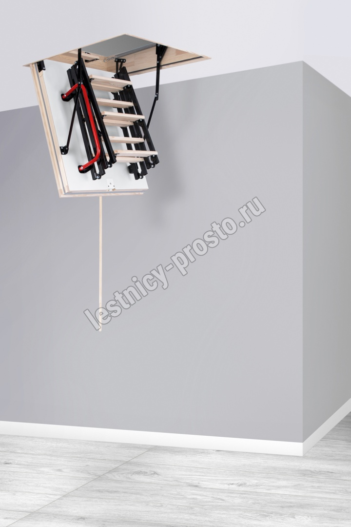 Складная 4-х секционная чердачная лестница. Ступени выполнены из сосны, имеют противоскользящие насечки, направляющие из металла.