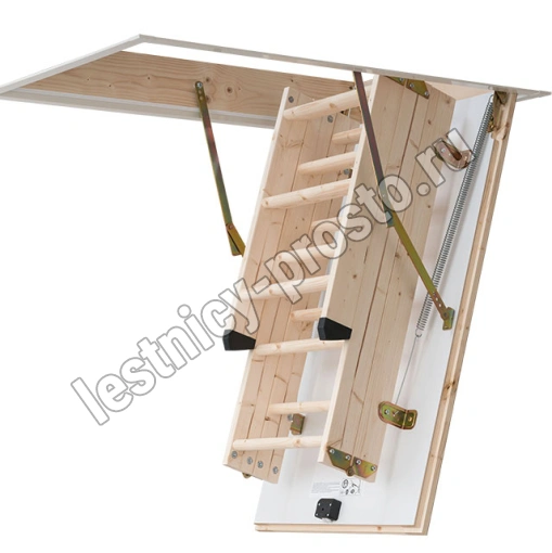 PROF 36 - трехсекционная утепленная лестница из скандинавской медленнорастущей ели, отличающейся повышенной прочностью, ступени из сосны, имеют антискользящие насечки. Лестница оснащена поворотным замком, надежно фиксирующим люк в закрытом состоянии. Высоту базовой модели можно увеличить при помощи дополнительной секции до 3500 мм. Размер короба: 1175х676 мм
