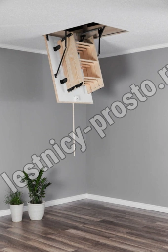 Лестница складная четырехсекционная, изготовлена из массива сосны. Термоизоляционная крышка типа "сэндвич" утеплена пенопластом толщиной 20 мм, облицована с двух сторон ДСП белого цвета.