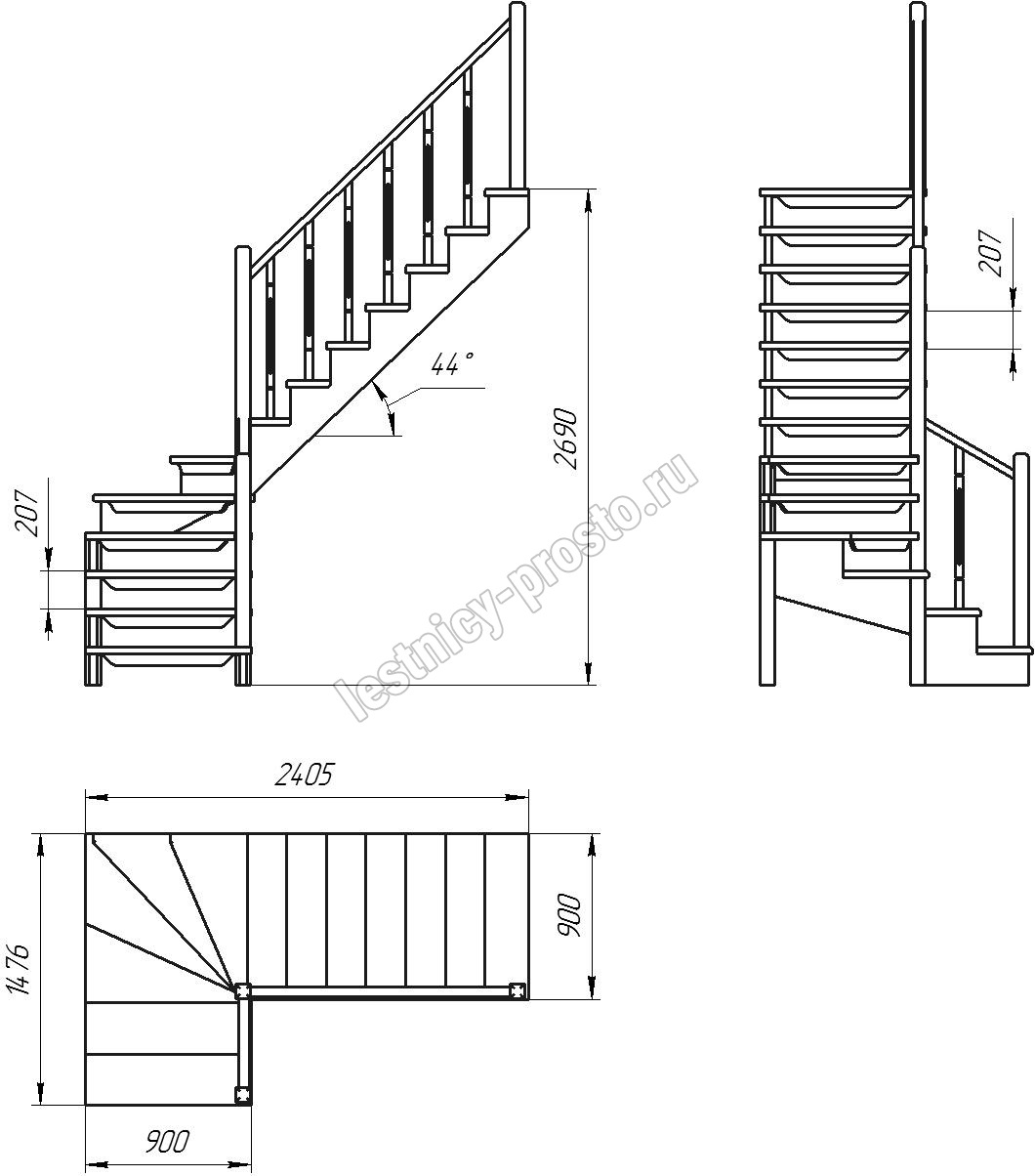 Деревянная межэтажная лестница ЛЕС-09 2690 проем 2405-900, Лиственница