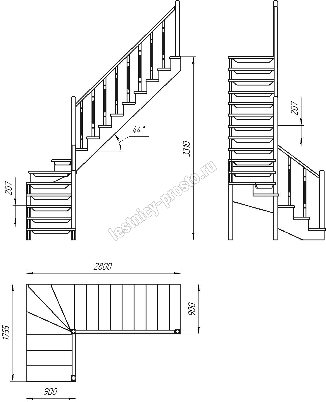 Деревянная межэтажная лестница ЛЕС-09 3310 проем 2800-900, Бук