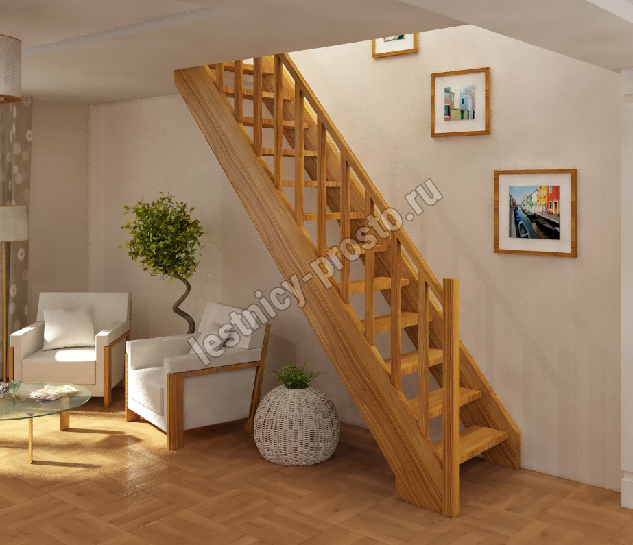 Базовый комплект включает в себя деревянные элементы лестницы и ограждения без какого-либо покрытия. Ограждение можно установить справа или слева.