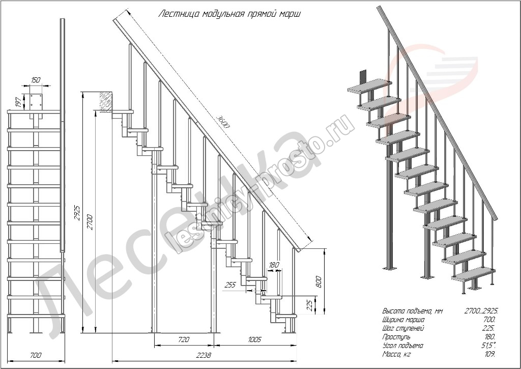 Модульная малогабаритная лестница Линия 2700-2925, Черный, Сосна, Крашеная, Без Ступений