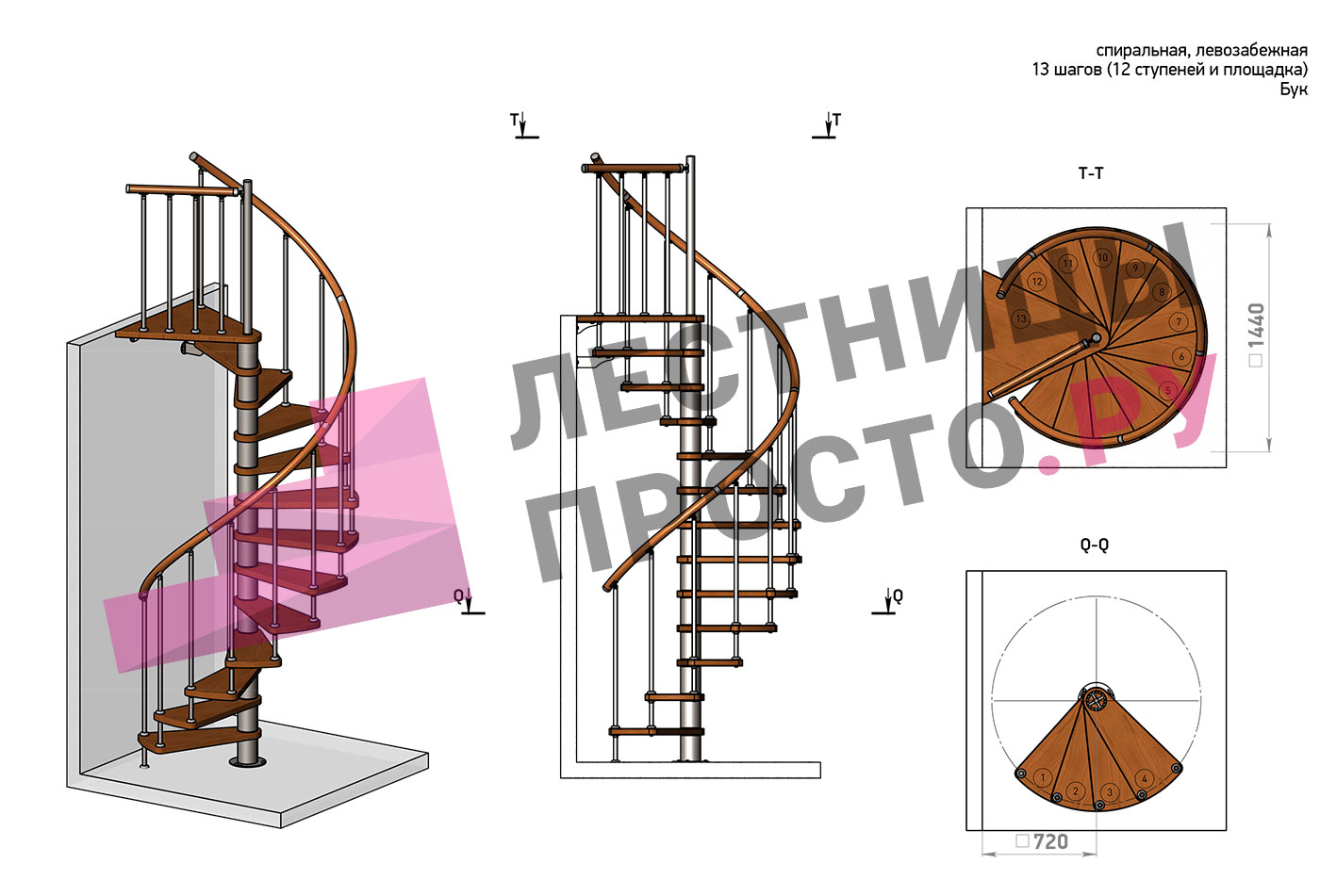 | Винтовая лестница Prosto Spiral White D140см, h303.9-348,1 см, бук |